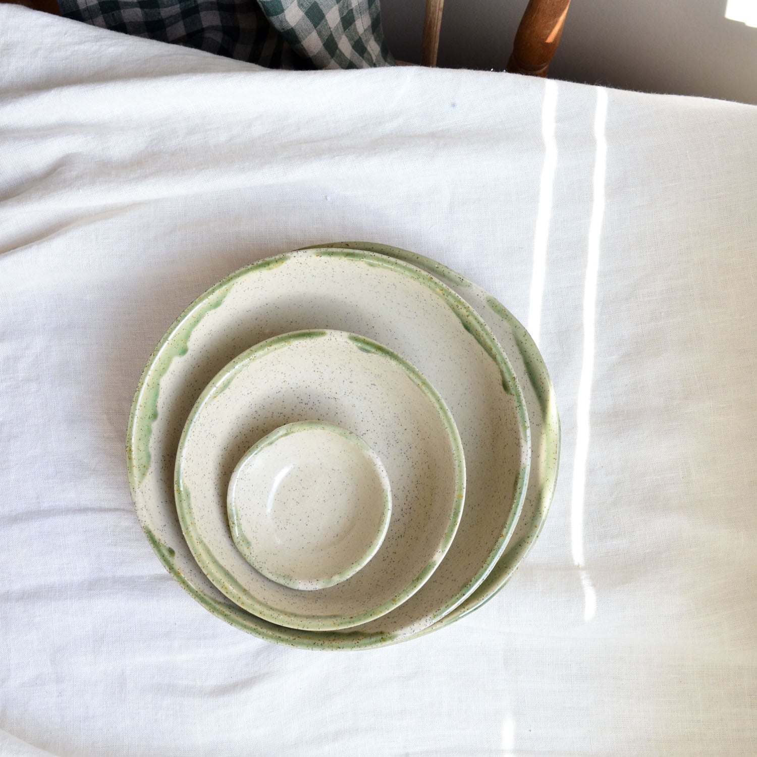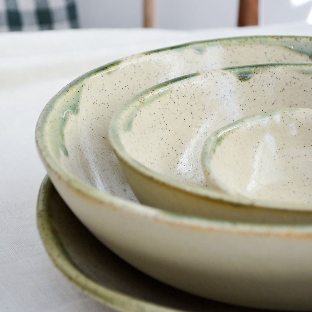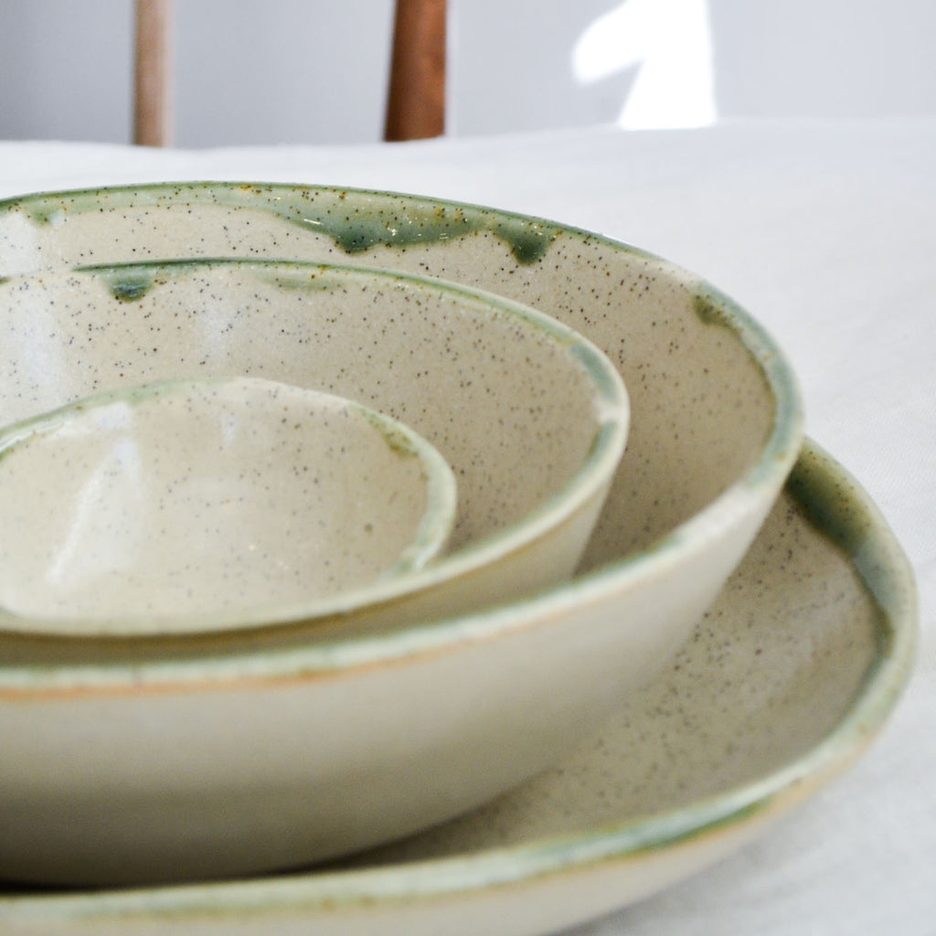 Elevate your table with the timeless charm of our Moss dinnerware range, a standout addition to our Christmas collection that seamlessly blends festive warmth with year-round versatility. Crafted from our signature natural stoneware clay, each piece features a subtle speckle that adds depth and character. The hand-glazed moss green rim, with its organic, slightly drippy finish, brings a rustic yet refined touch, making every meal feel like a special occasion.