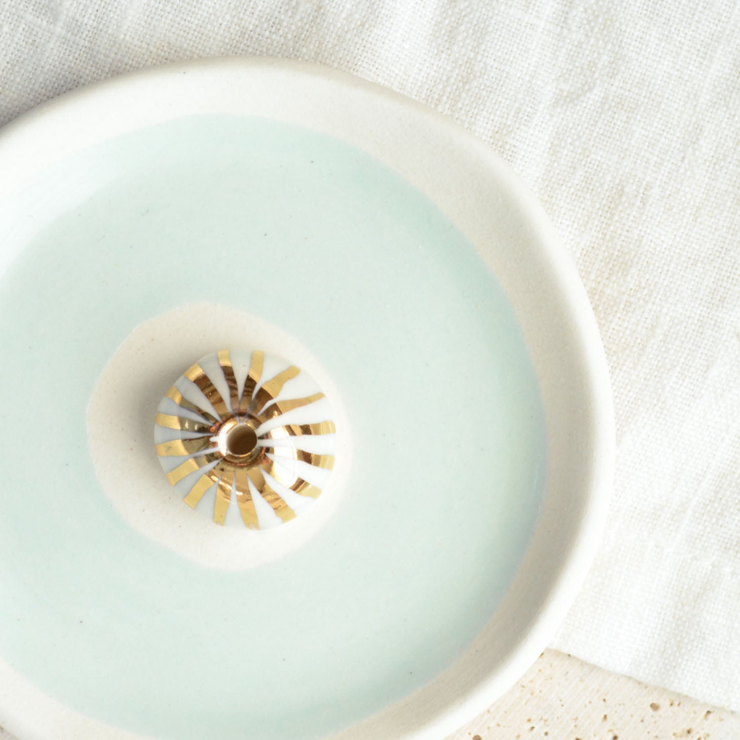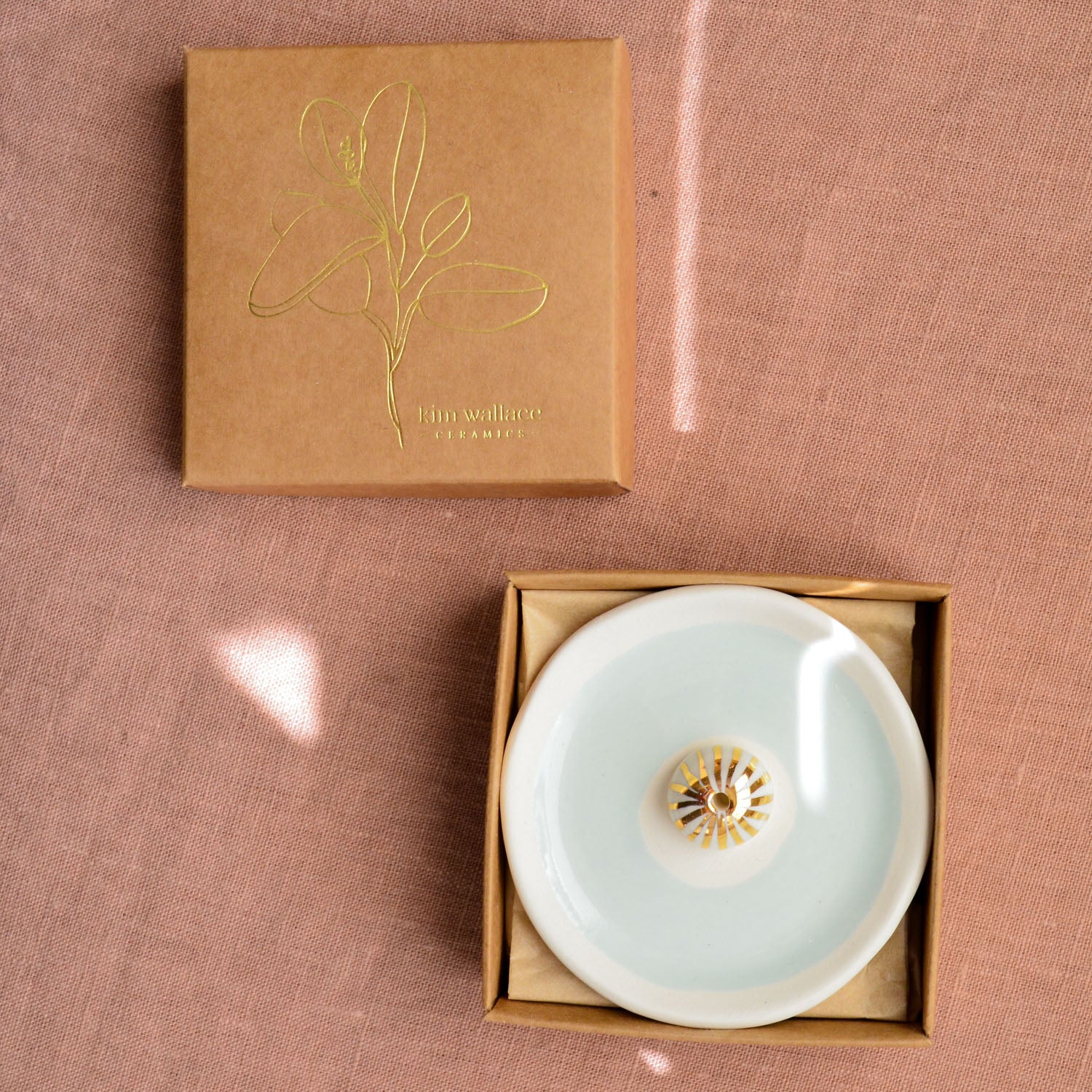 Handmade in our Noosa studio from premium Australian porcelain, this elegant ceramic incense holder features a true gold lustre for a rich, luxurious finish that catches the light beautifully.