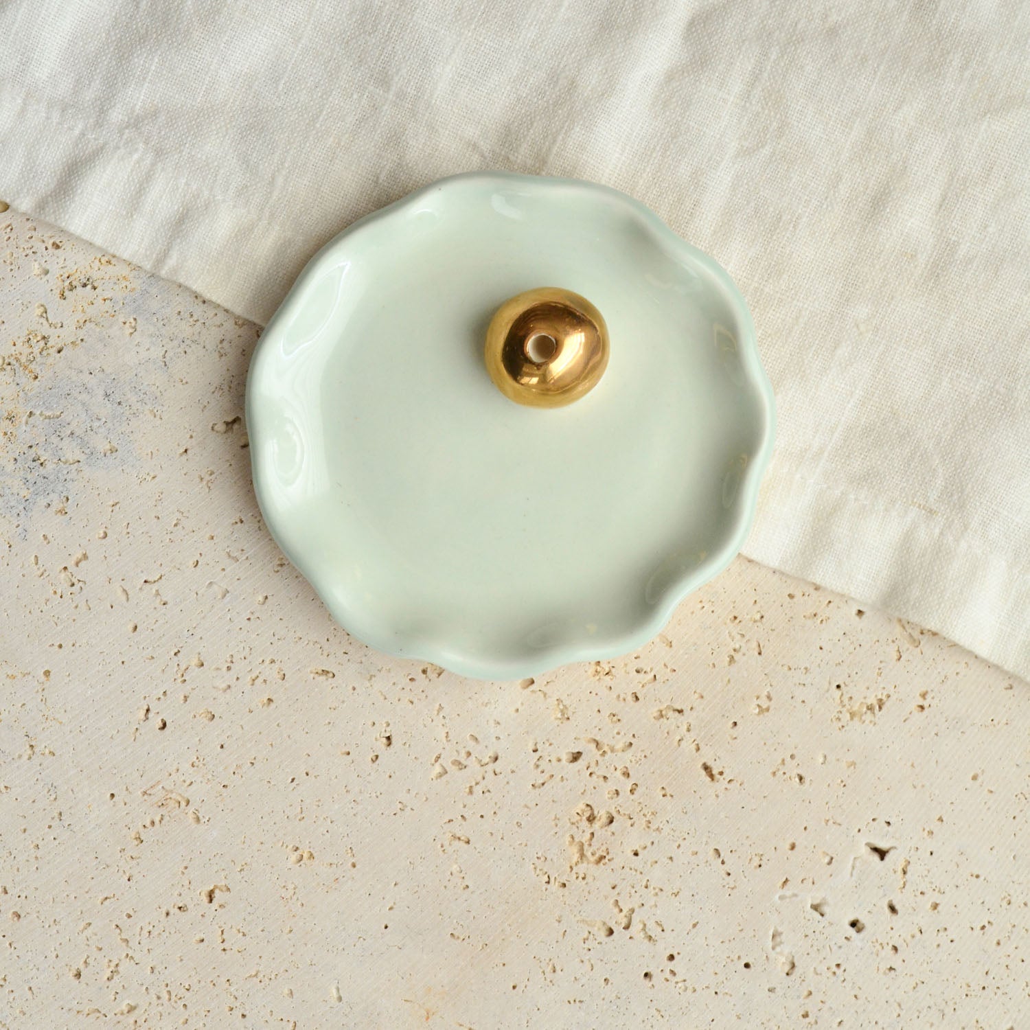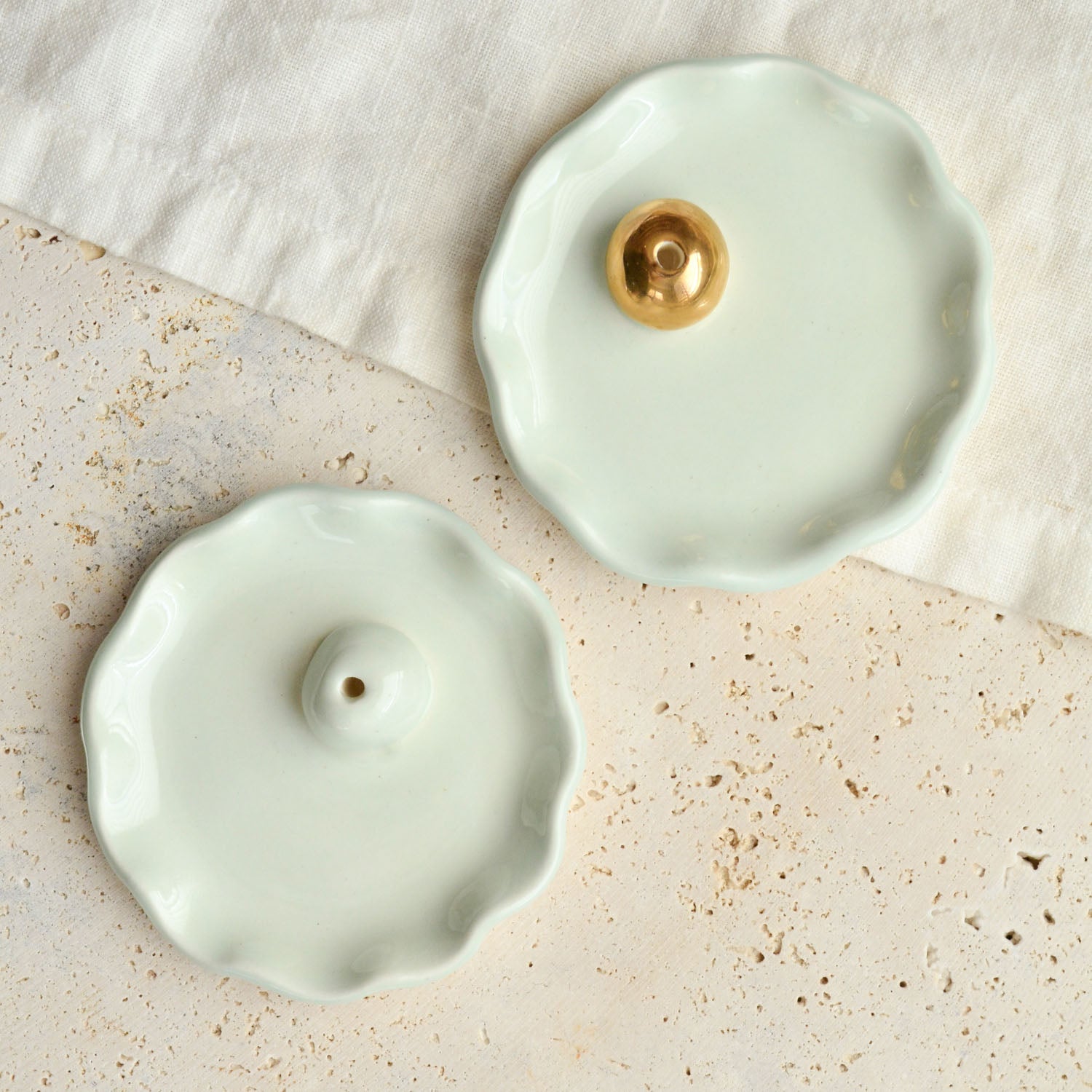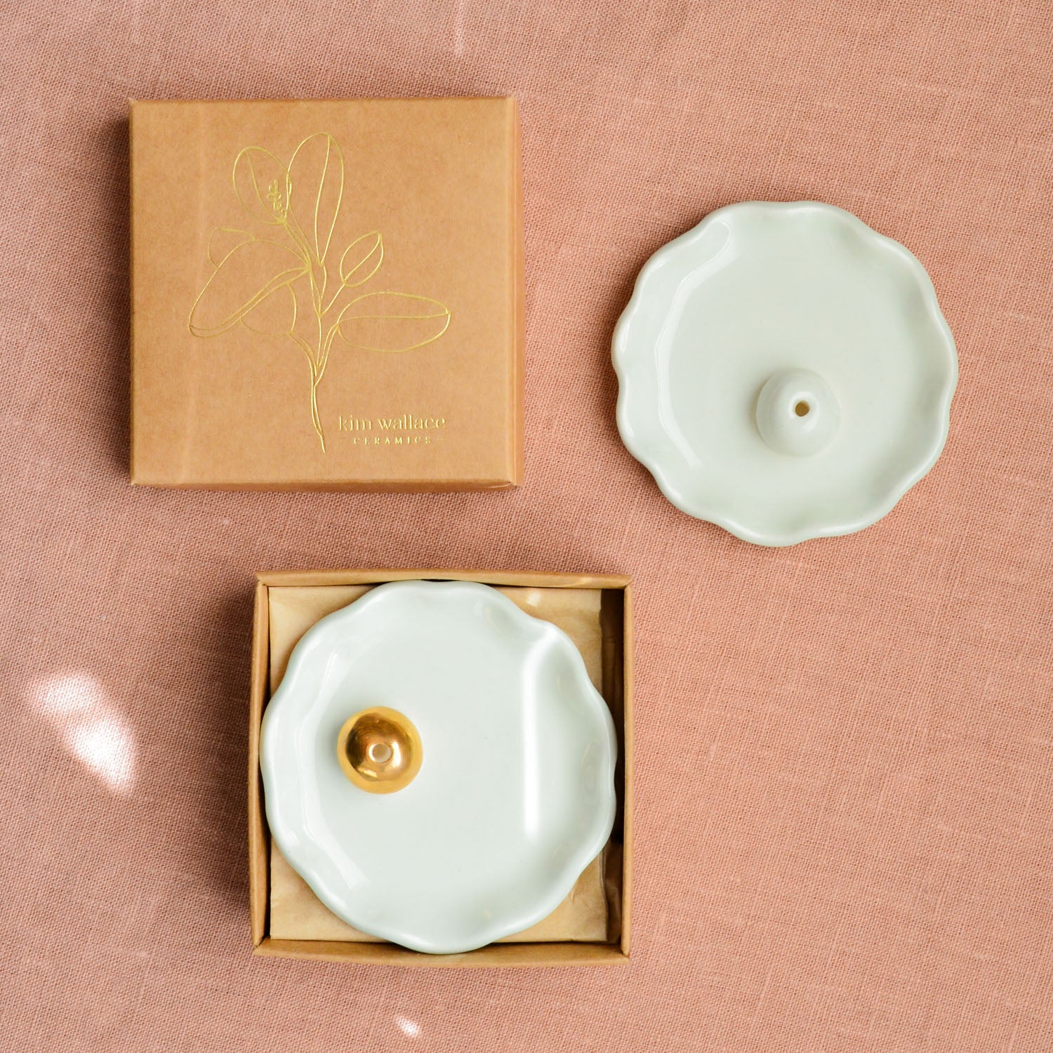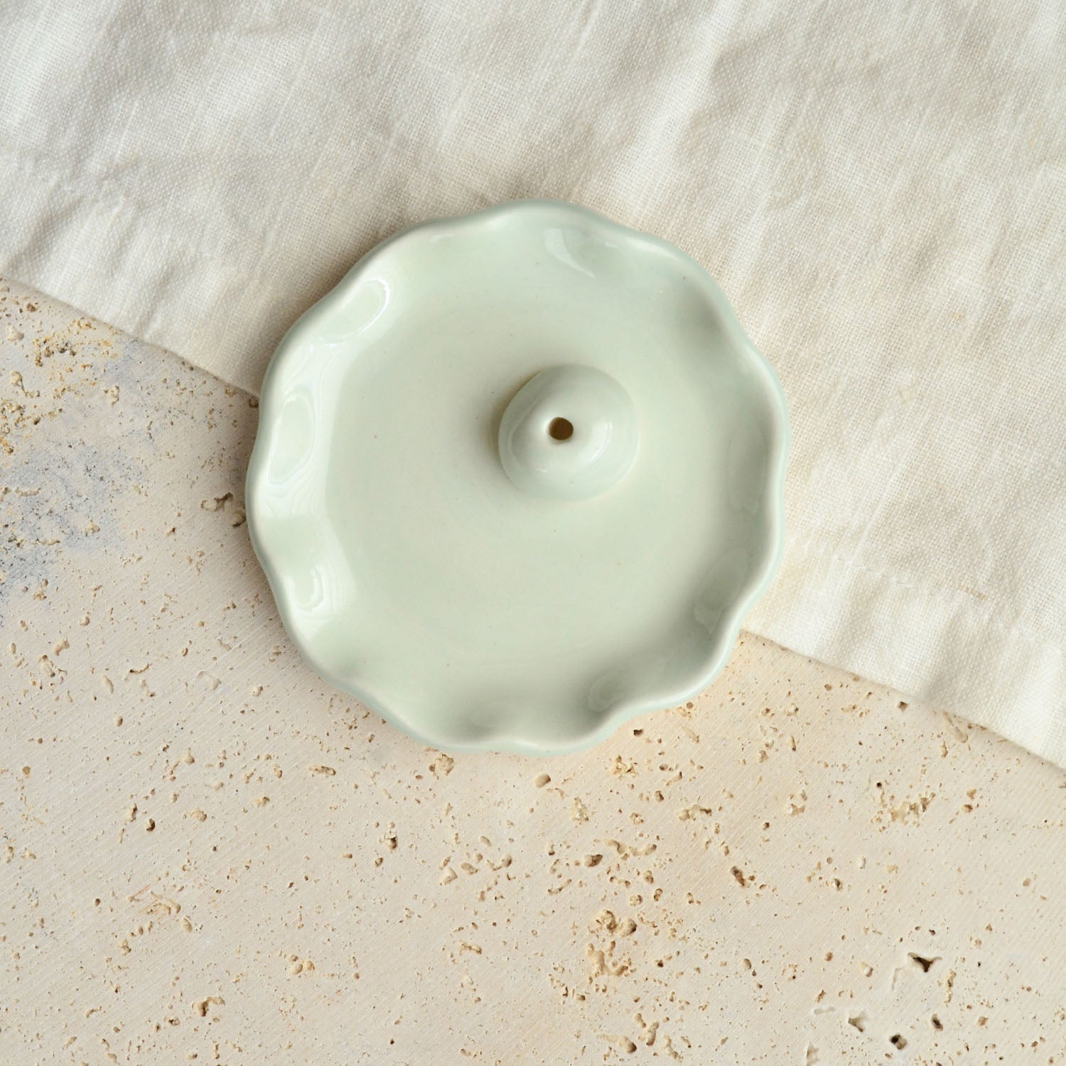 Handmade in our Noosa studio from premium Australian porcelain, this elegant ceramic incense holder features a playful ruffle edge for a fun, decorative look and is finished in our dreamy soft blue Mist glaze.