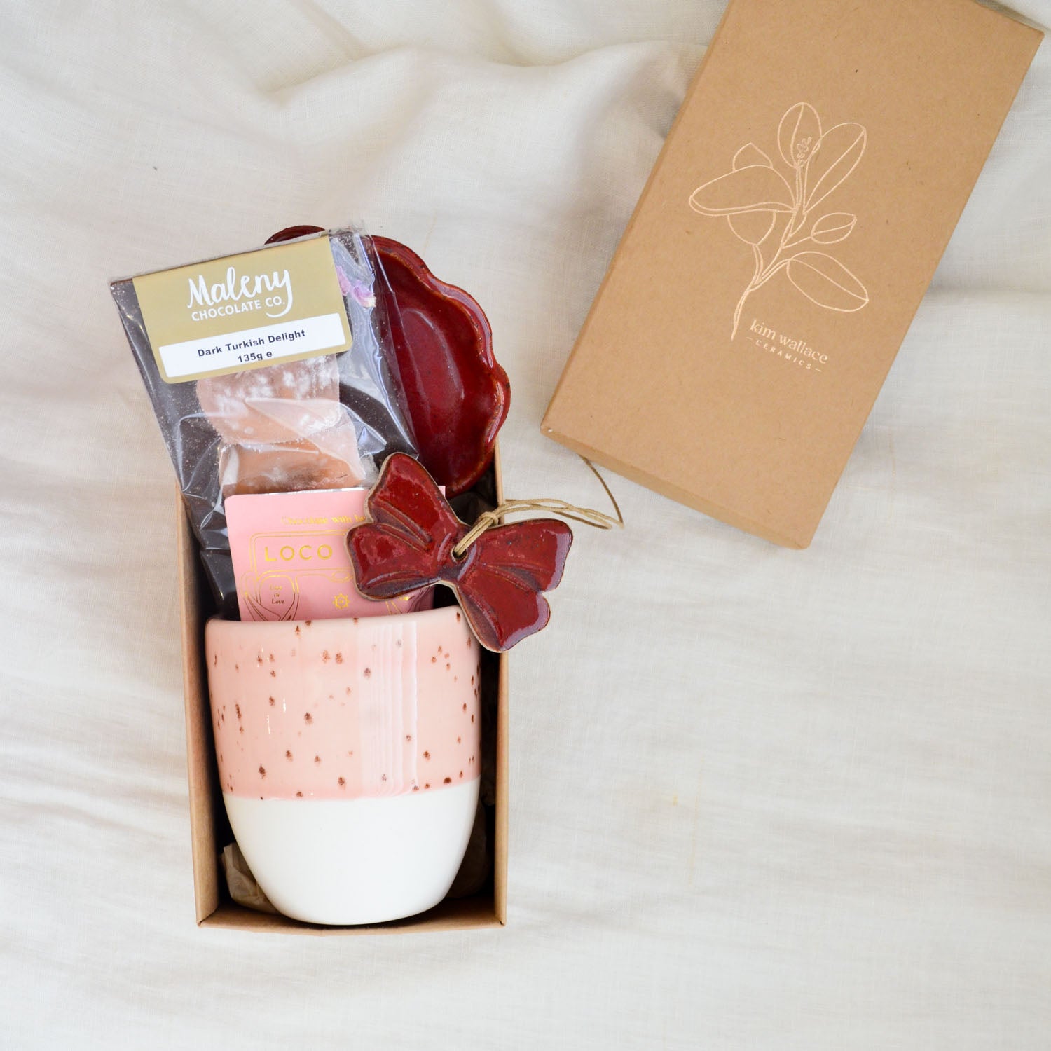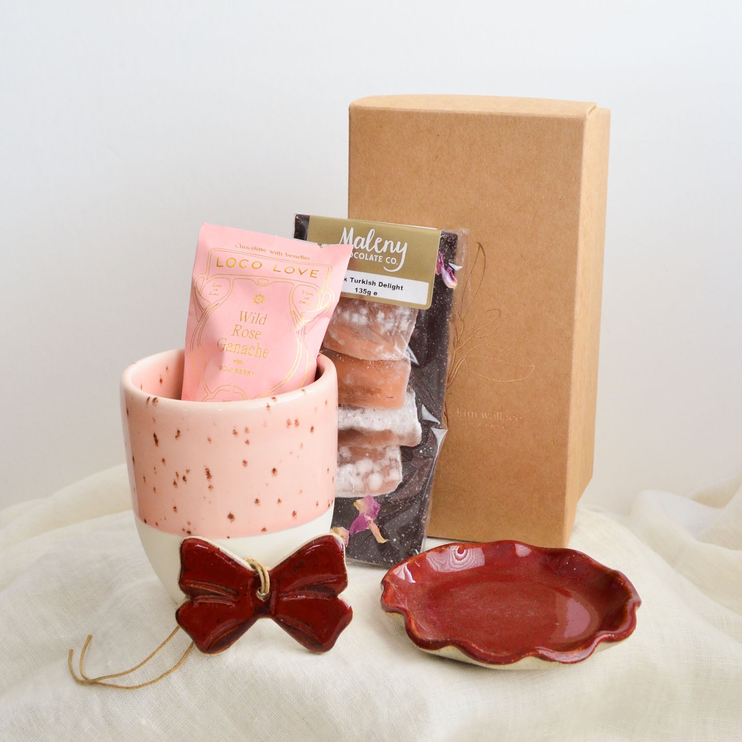 This luxurious curation—featuring the dusk pink cup, a bar of Turkish delight-infused chocolate, the romantic rose ganache from Loco Love, the vintage red ruffle dish, and the charming red bow ornament, all nestled in a kraft gift box with gold foil—perfectly blends handmade Australian ceramics with indulgent, floral-sweet treats.