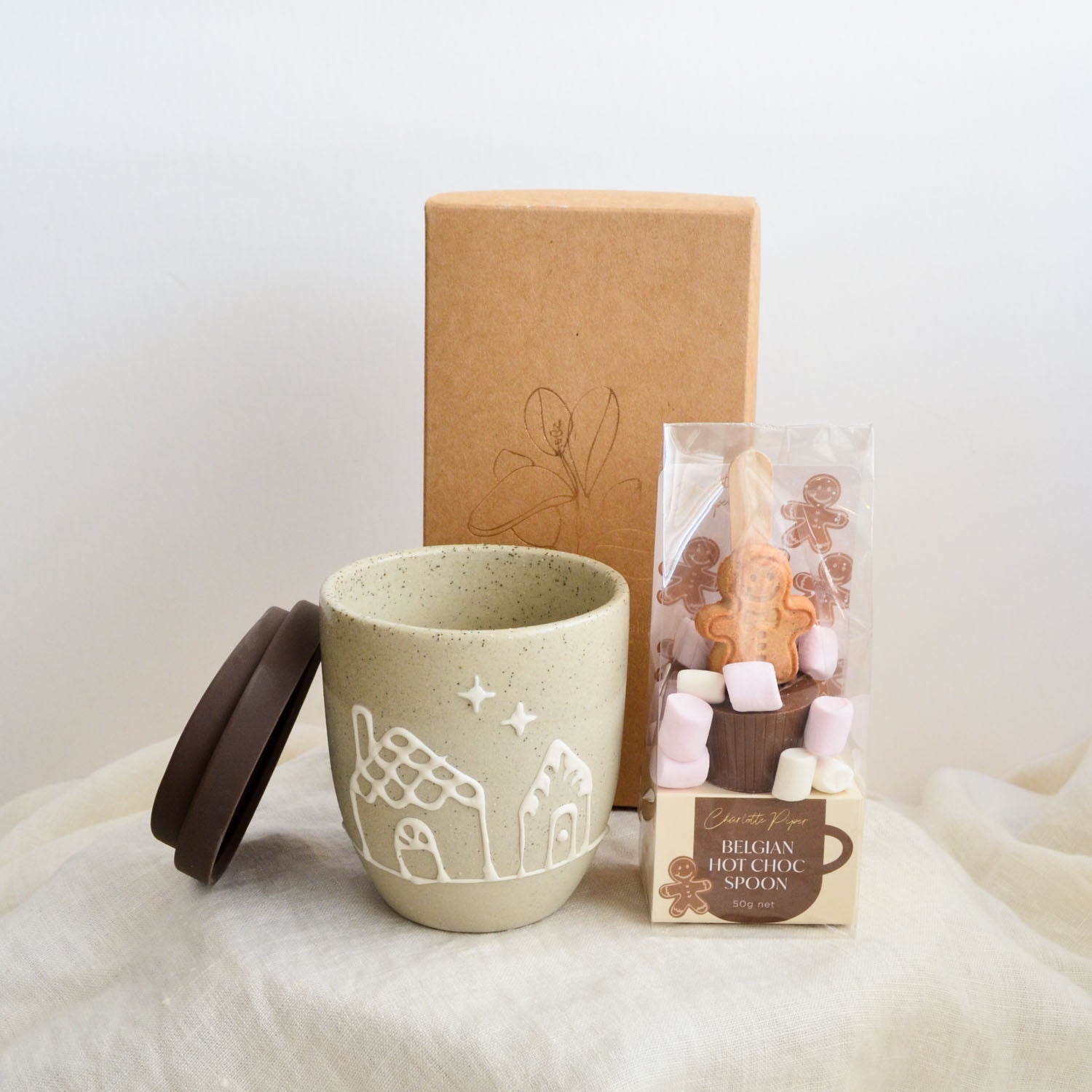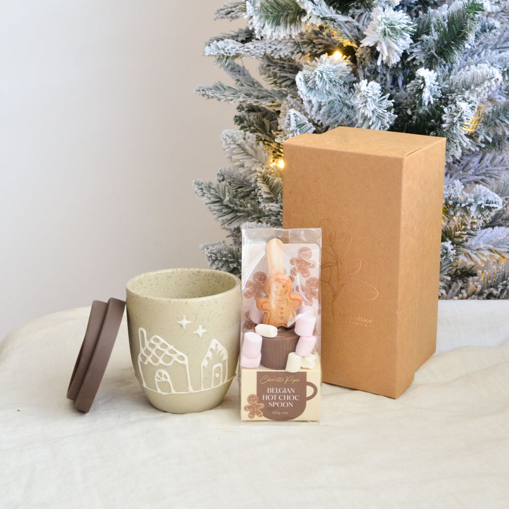 Our limited-edition Gingerbread Gift Set is pure cosiness in a box: a handmade Gingerbread Cup with lid (perfect for keeping your drink warm) plus an adorable gingerbread-shaped hot chocolate spoon—simply stir into hot milk for instant festive bliss. Beautifully packaged and ready to gift, it’s the sweetest thank-you, teacher, or secret-Santa surprise.