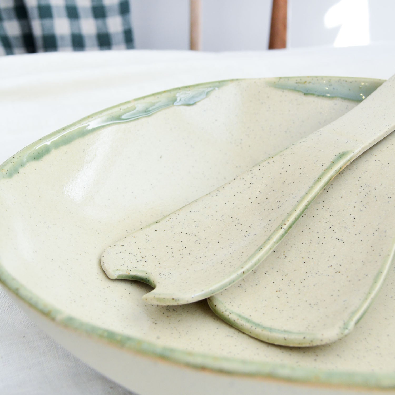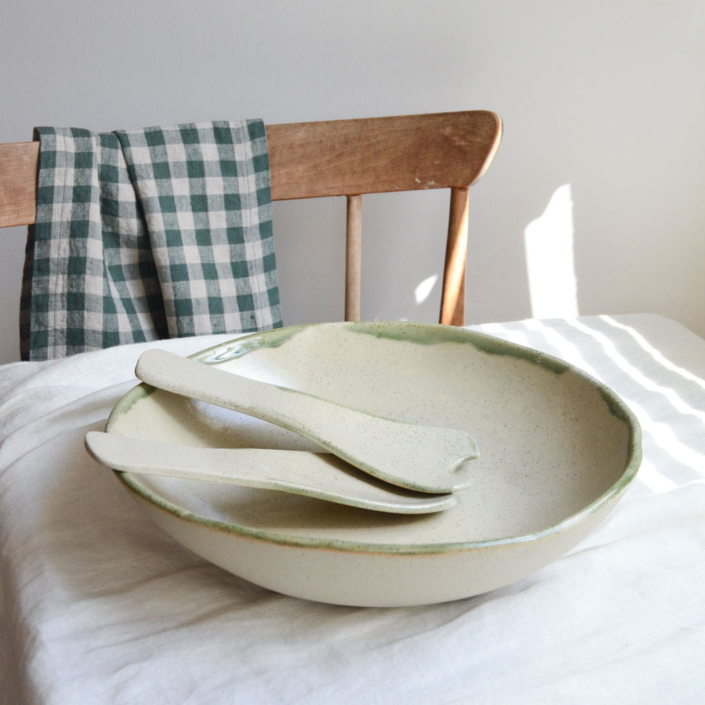 This serving bowl will be wrapped in our biodegradable paper 'bubble wrap' for safe shipping, or choose our signature kraft gift box with gold foil embossing. Add a set of matching handmade salad servers to complete the beautiful gift set! Please make your selection from the dropdown menu.