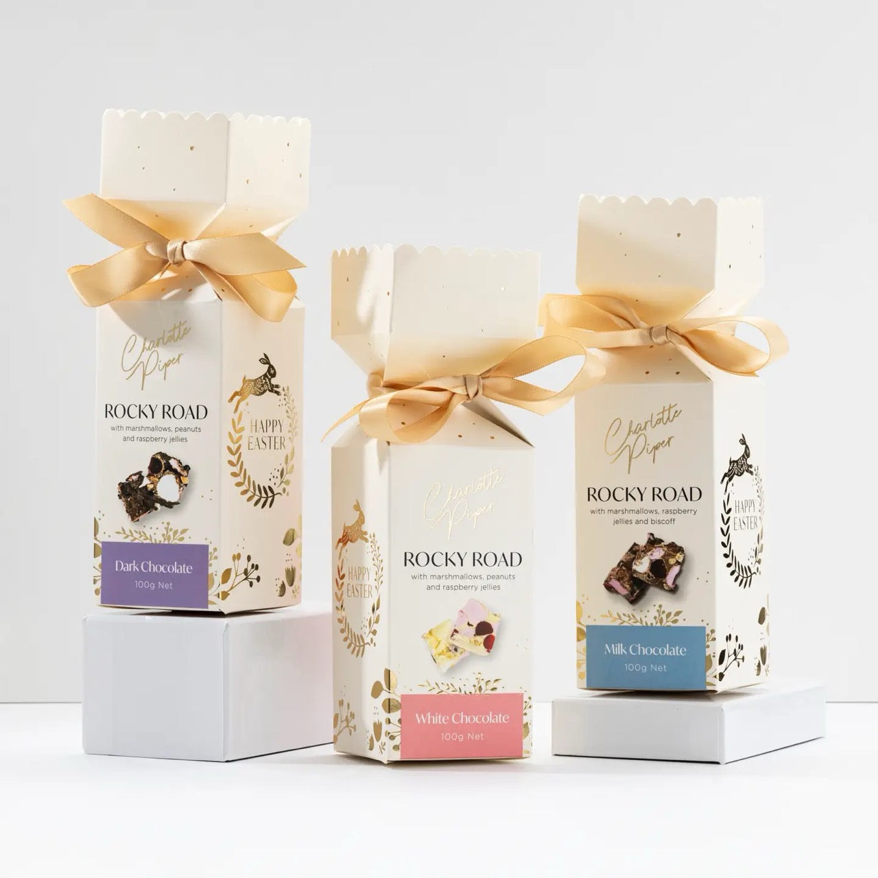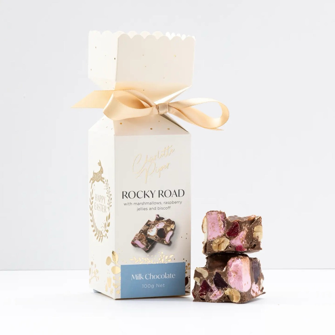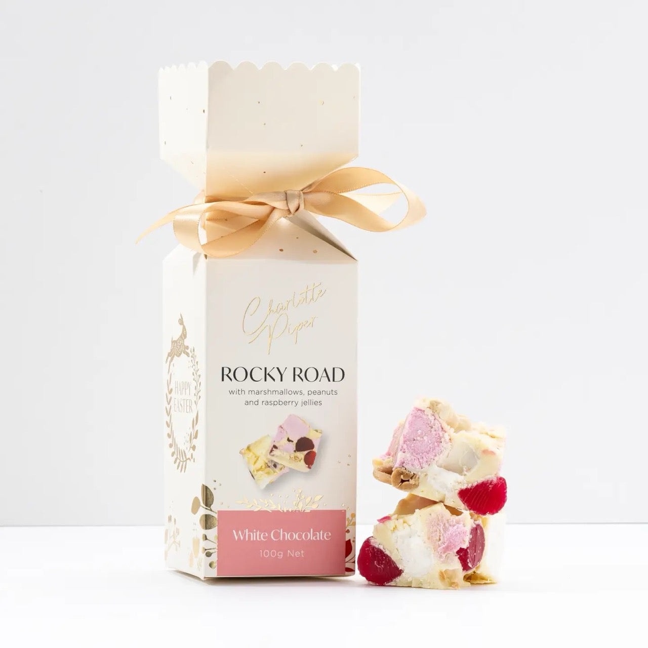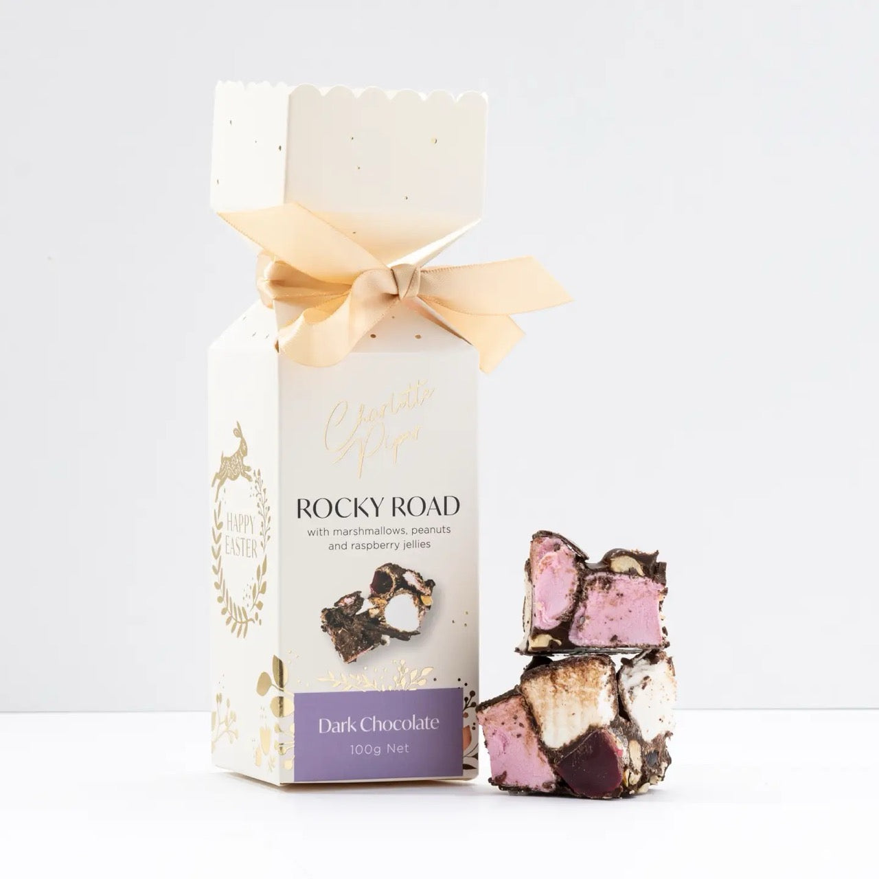 Charlotte Piper's Rocky Road Bars have been reimagined for Easter, bursting with fluffy marshmallows, crunchy nuts, and a medley of vibrant jelly pieces. Each morsel offers a jubilant balance of textures and flavours, celebrating whimsy and delight.