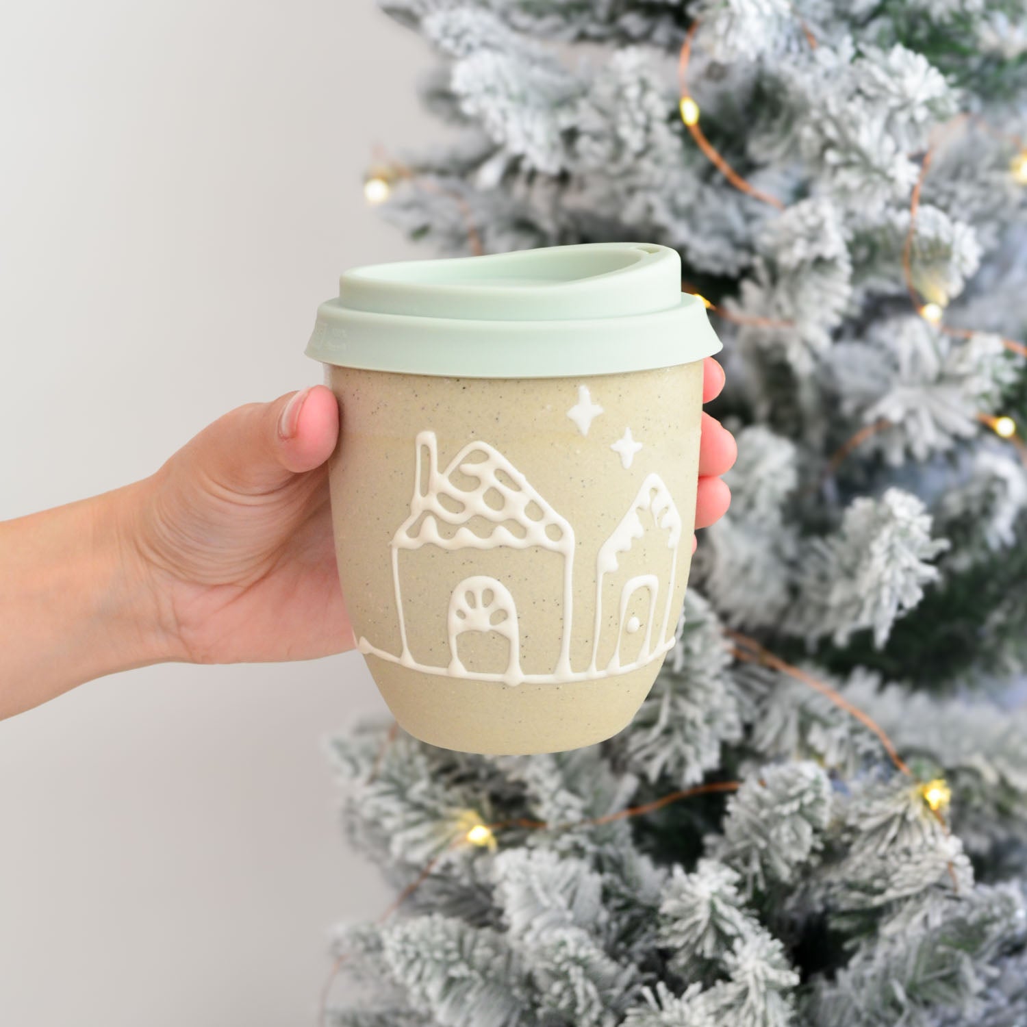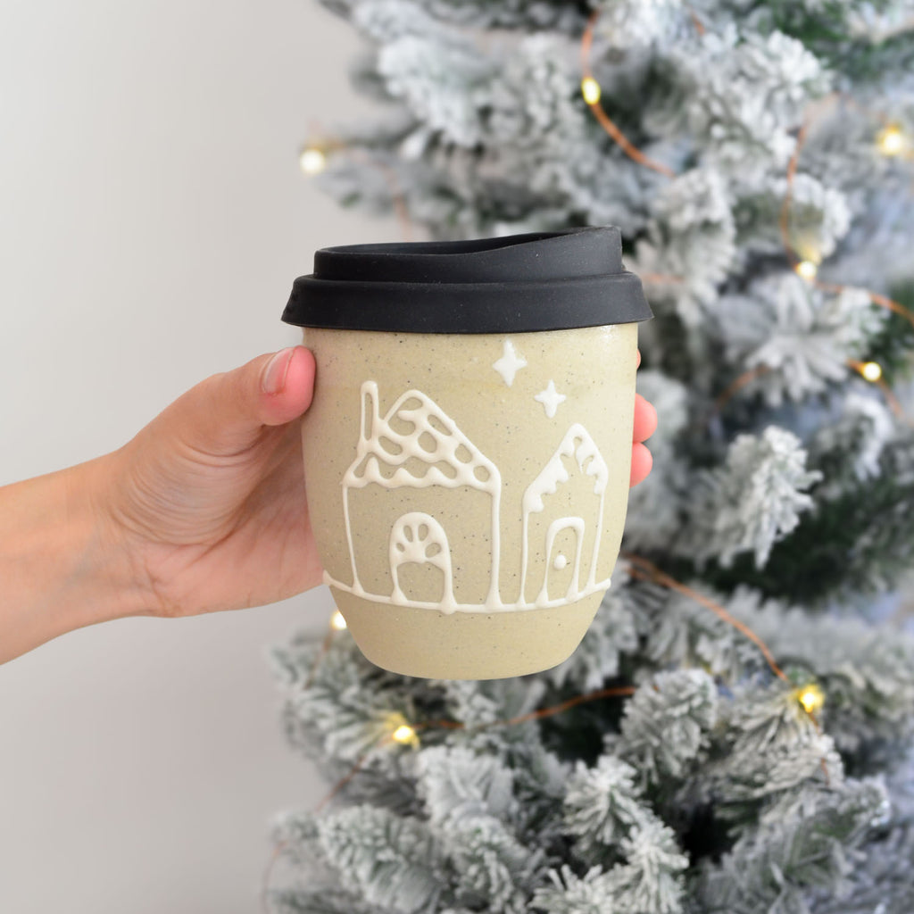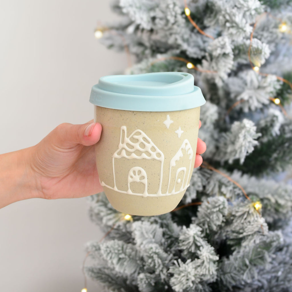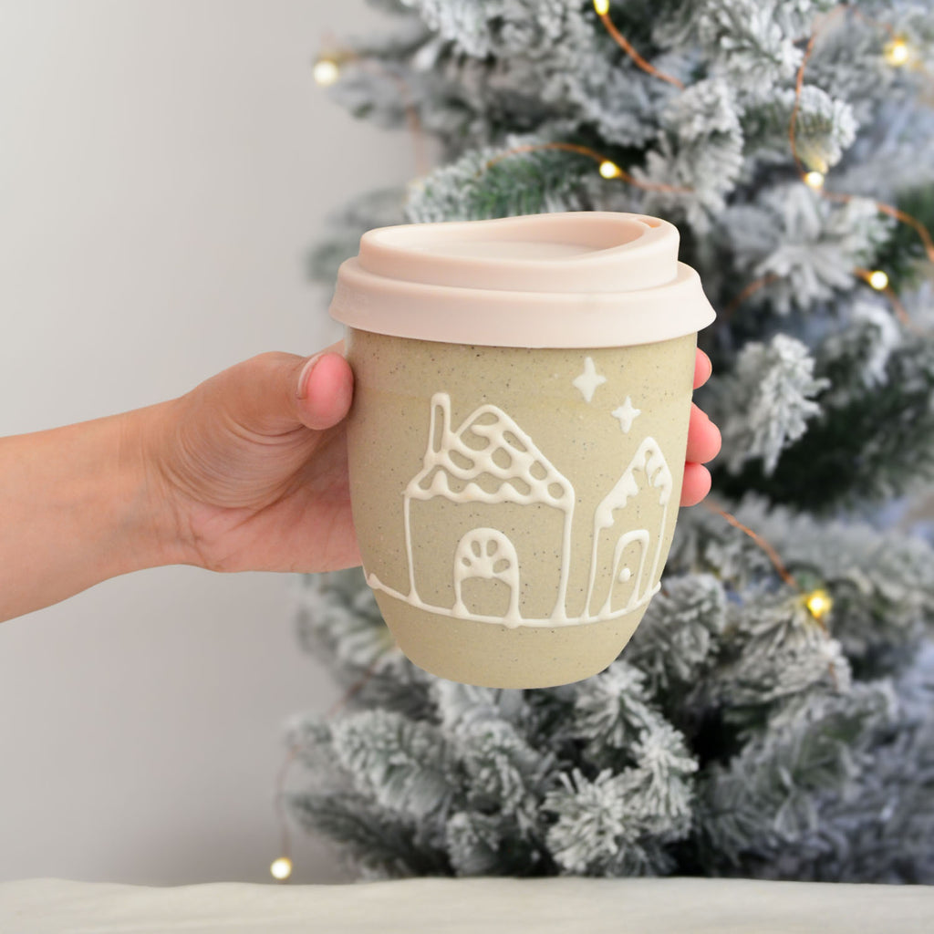 This cup features a pair of gingerbread houses on one side.