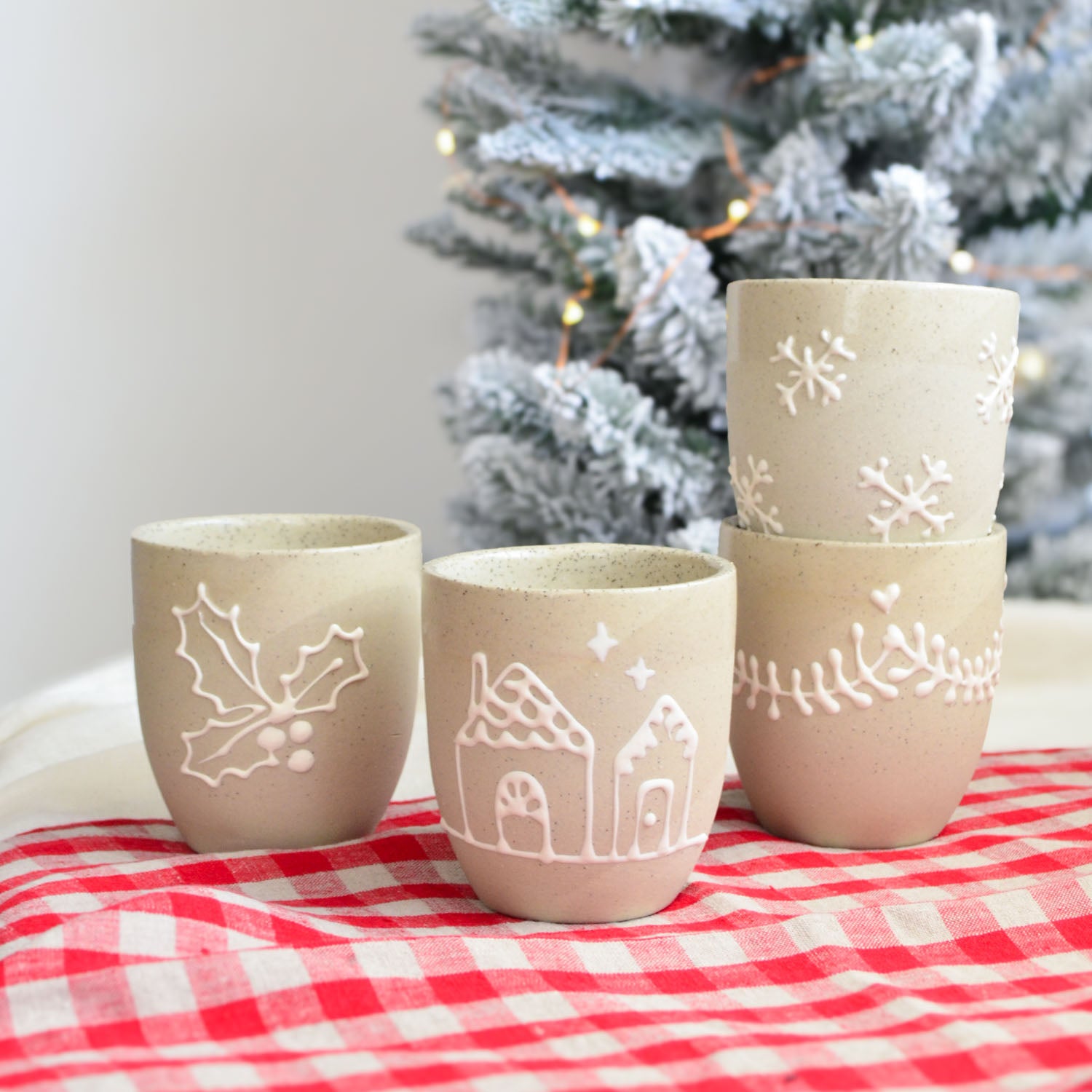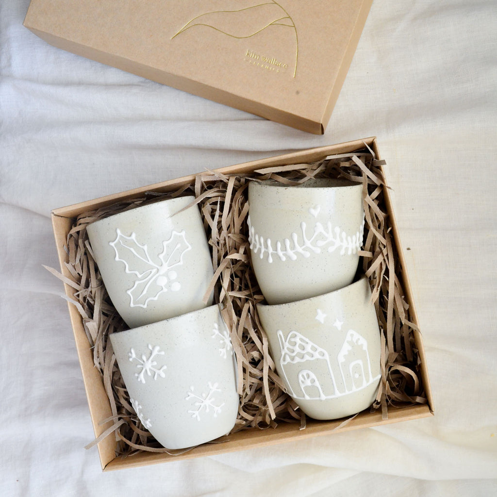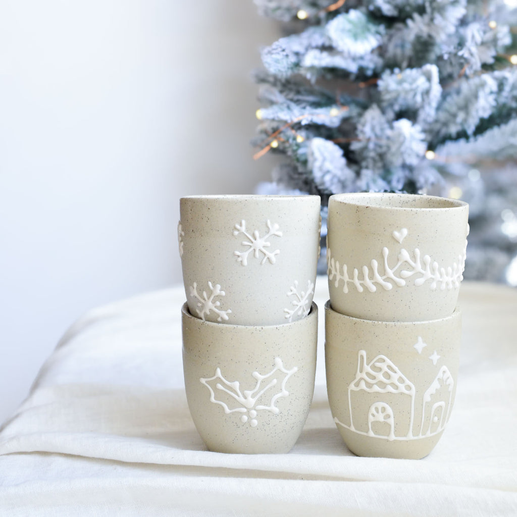 Our Gingerbread Collection features a charming celebration of festive traditions handcrafted in our warm Australian studio. Each cup in this series showcases intricate, hand-drawn Christmas patterns — Holly, Gingerbread Houses, Snowflakes, and Garlands— created using a white slip trailing technique on our natural stoneware, mirroring the delicate icing designs of gingerbread cookies and houses.