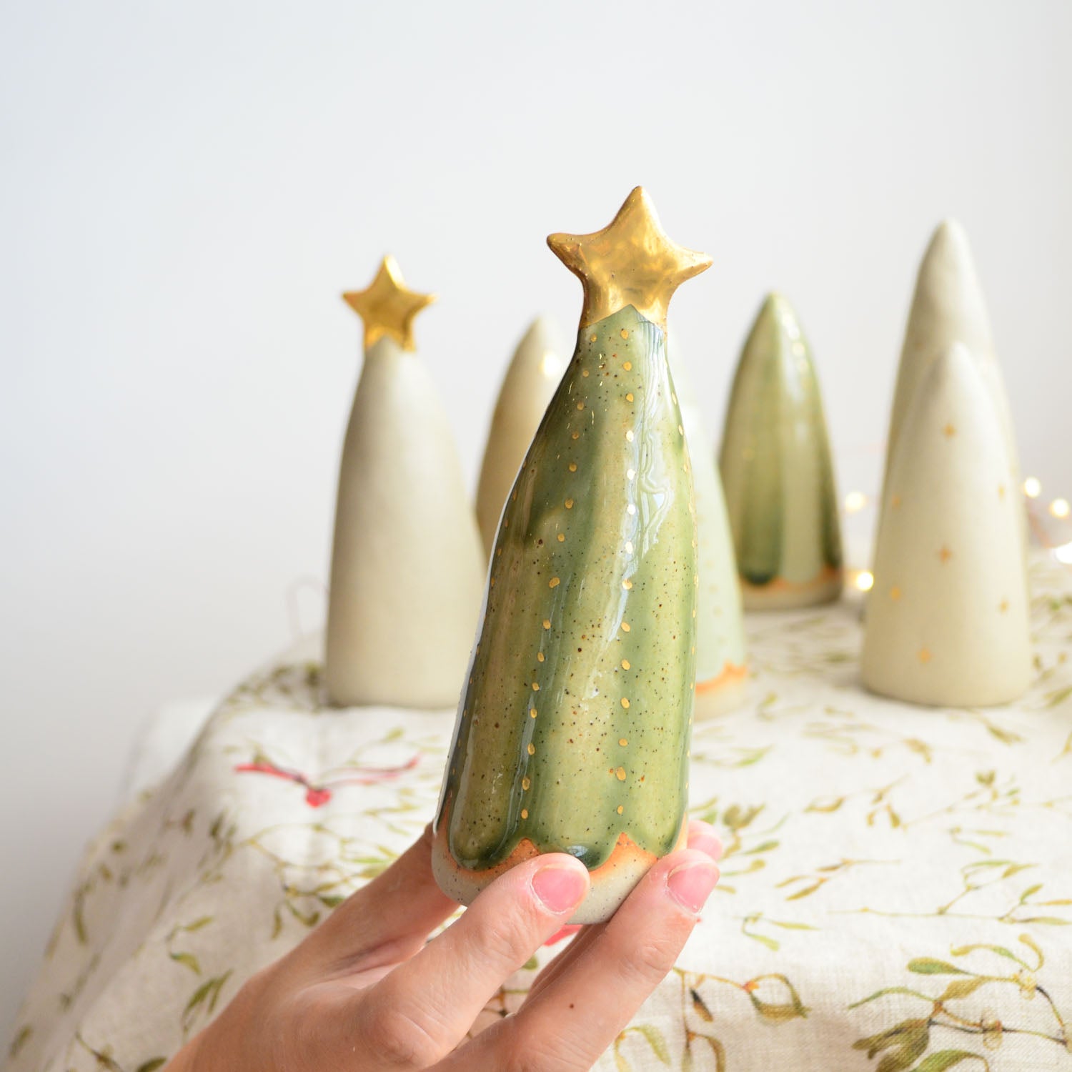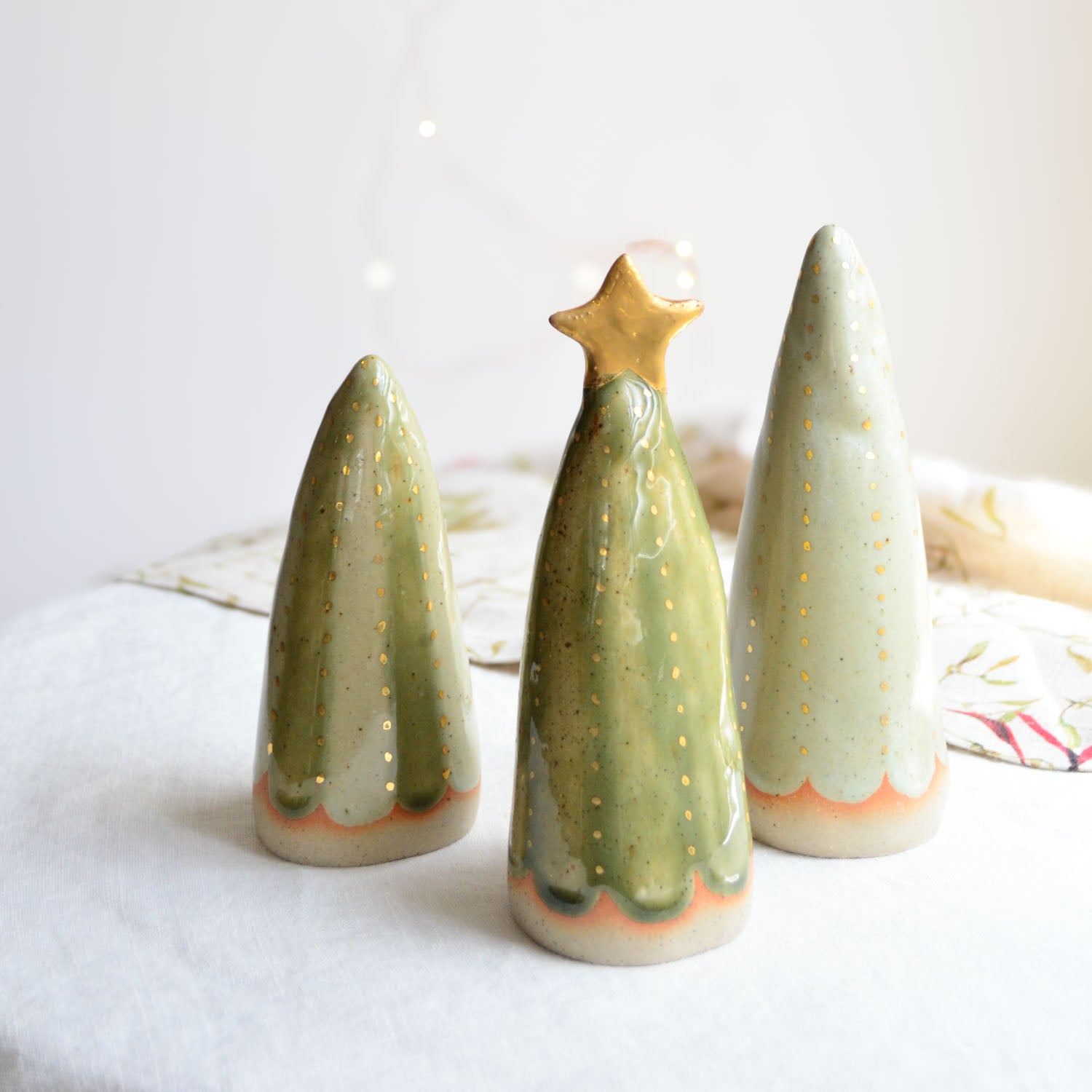Each tree is with finished with intricate, hand-painted true gold lustre patterns, adding festive elegance with a sparkling glow. Ideal for enhancing your Christmas dinner table, windowsill, hall table, or any corner needing a modern touch of holiday joy.