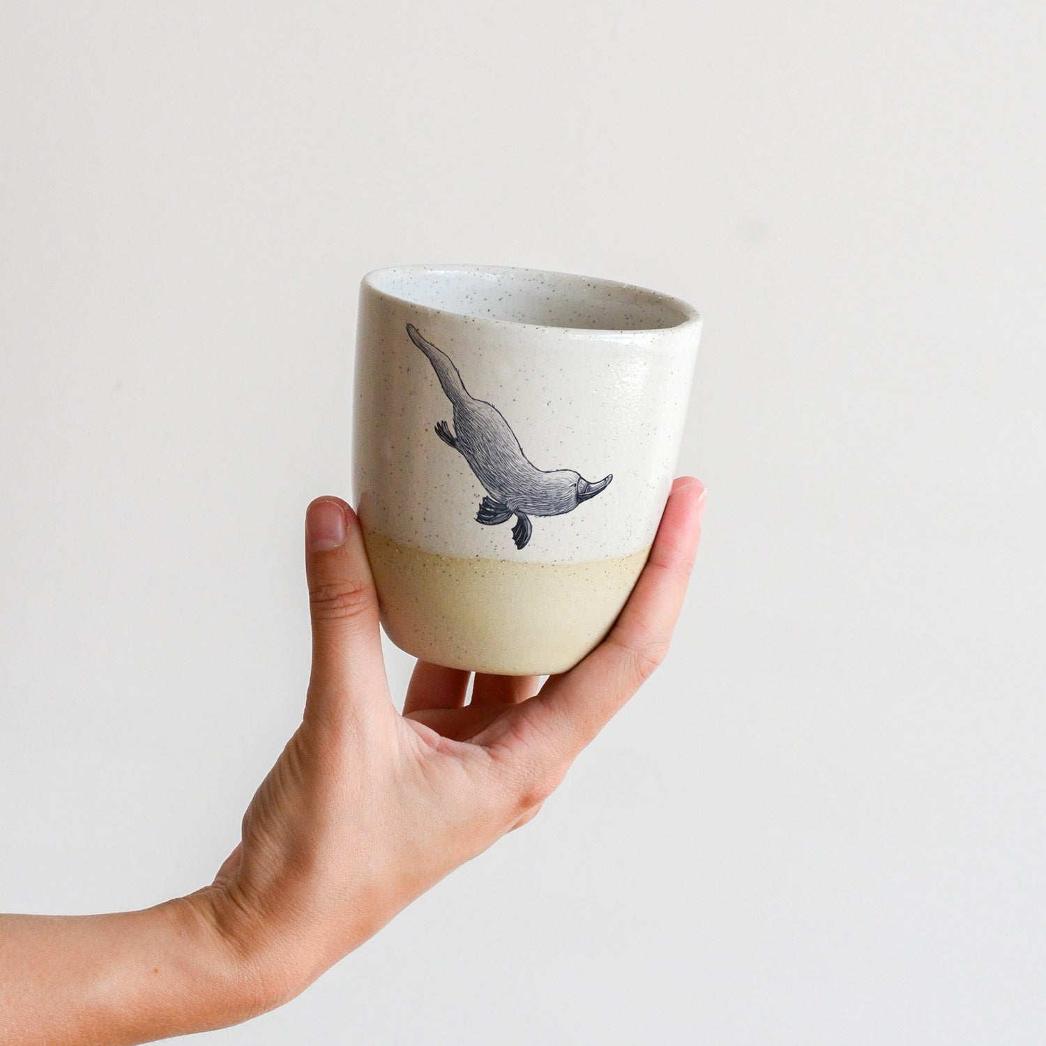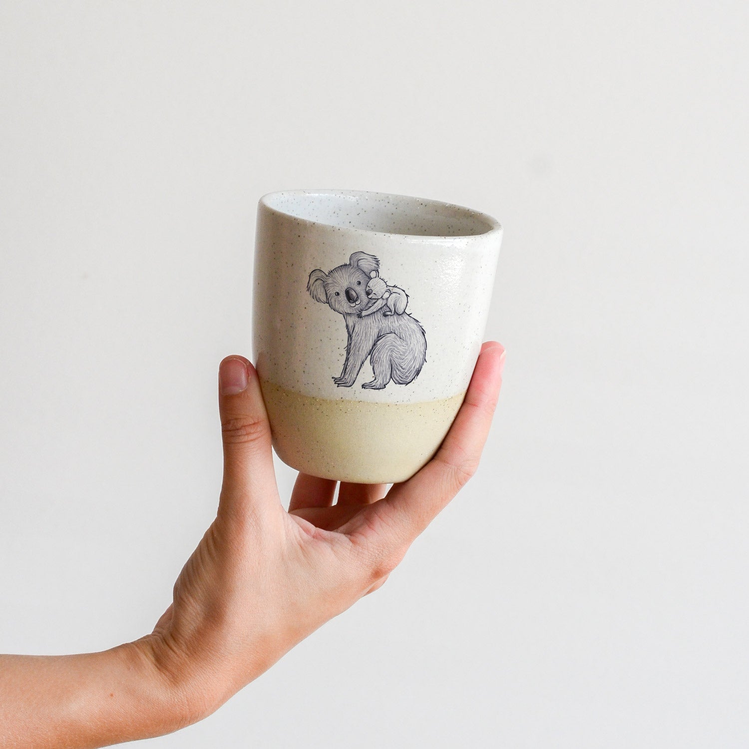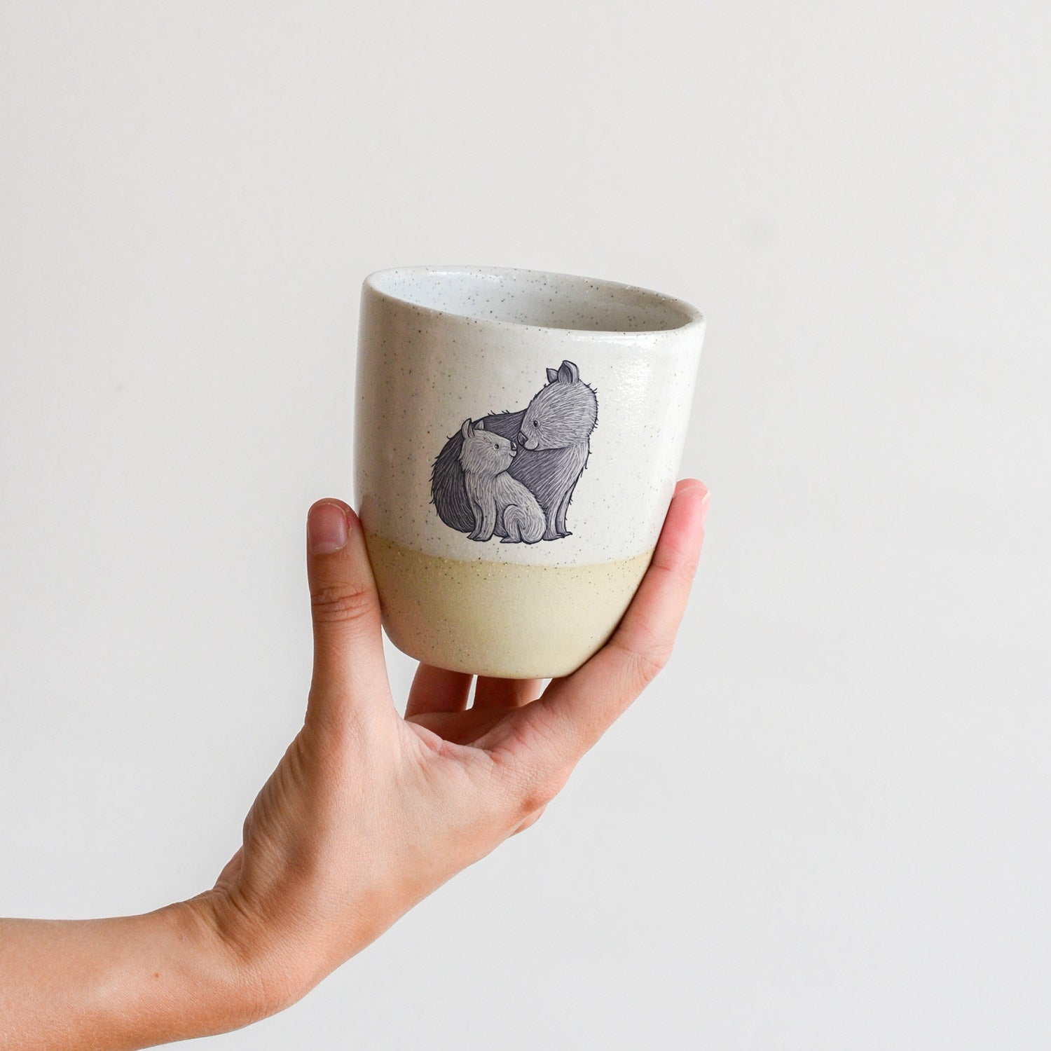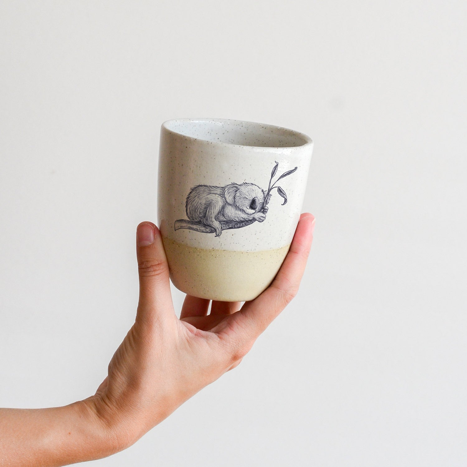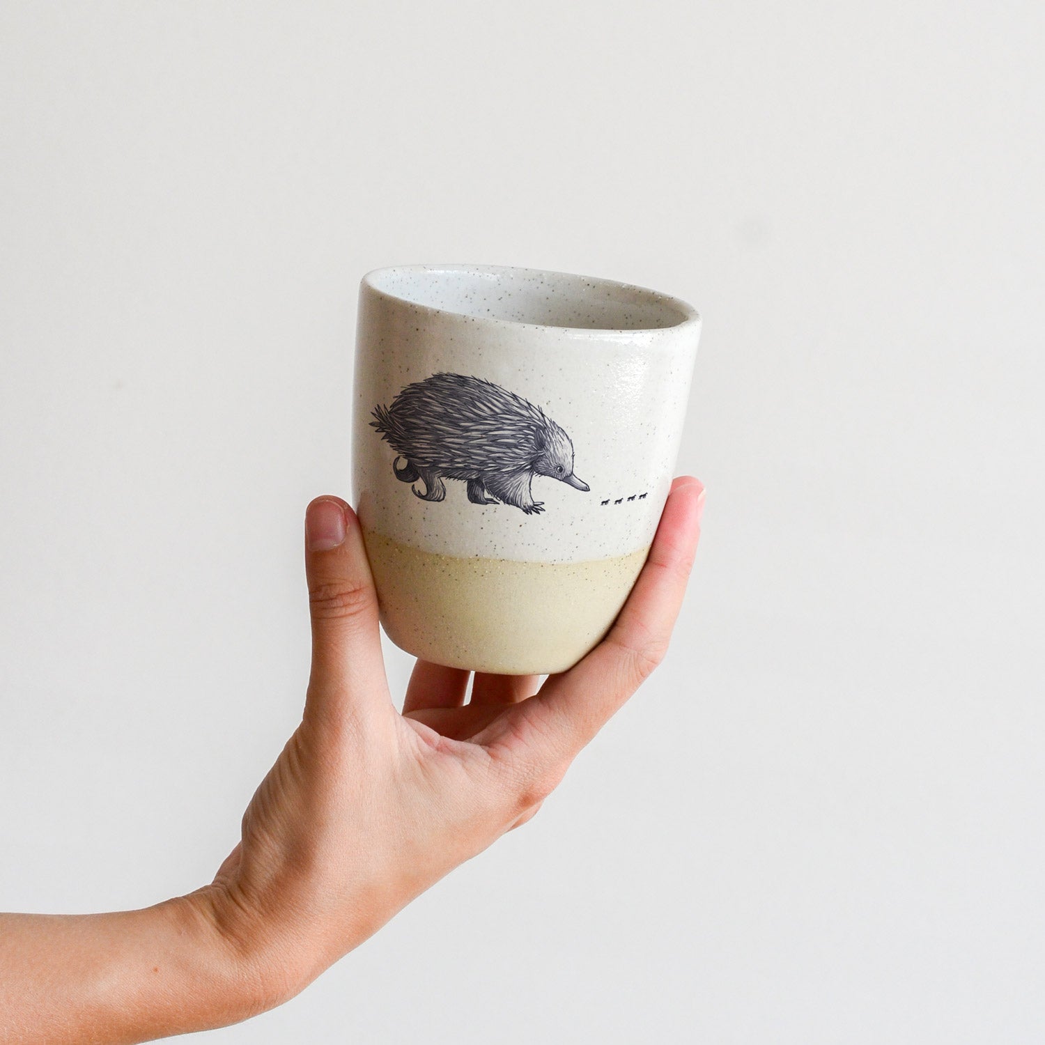 The stoneware cup has been slipcast and glazed by hand, creating a gorgeous organic feel with no two pieces exactly the same. Renee's illustration decal print has been applied by hand and fired again in the kiln for maximum durability.