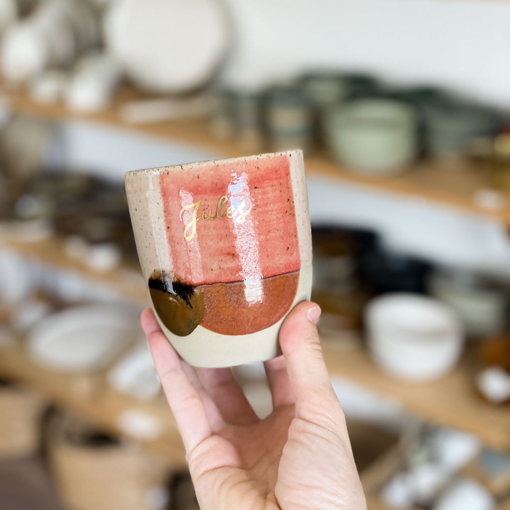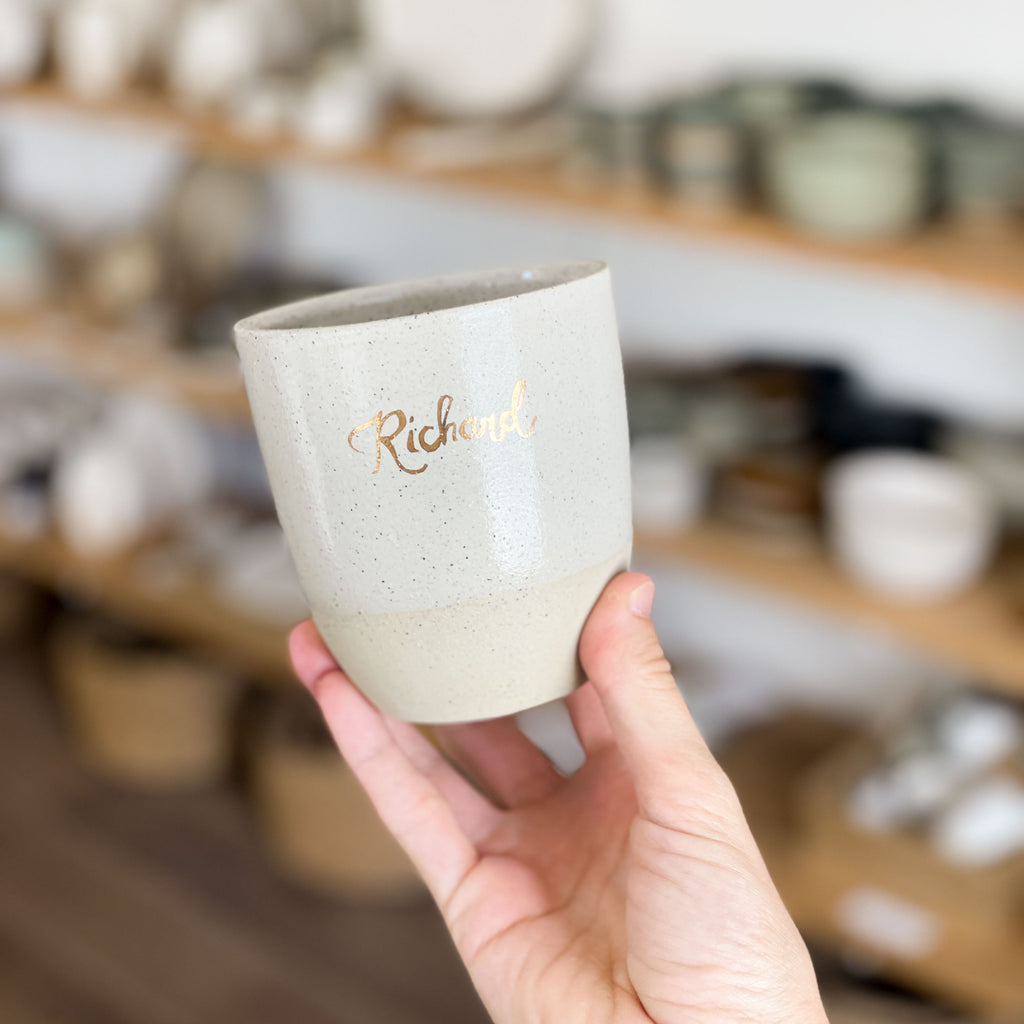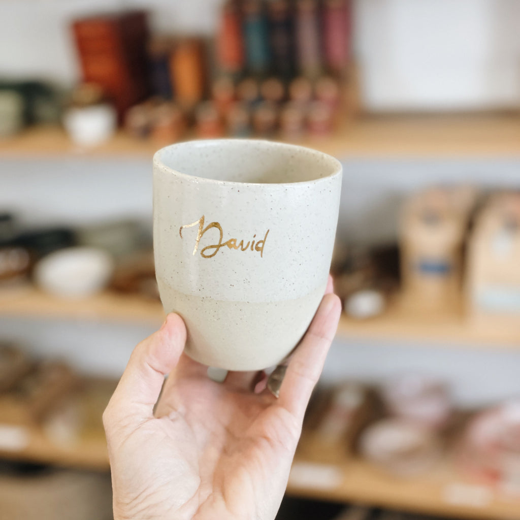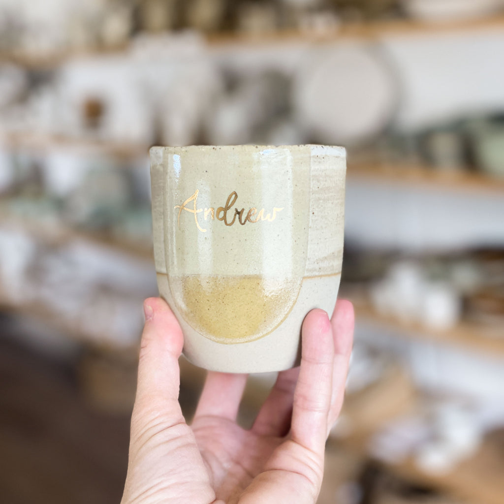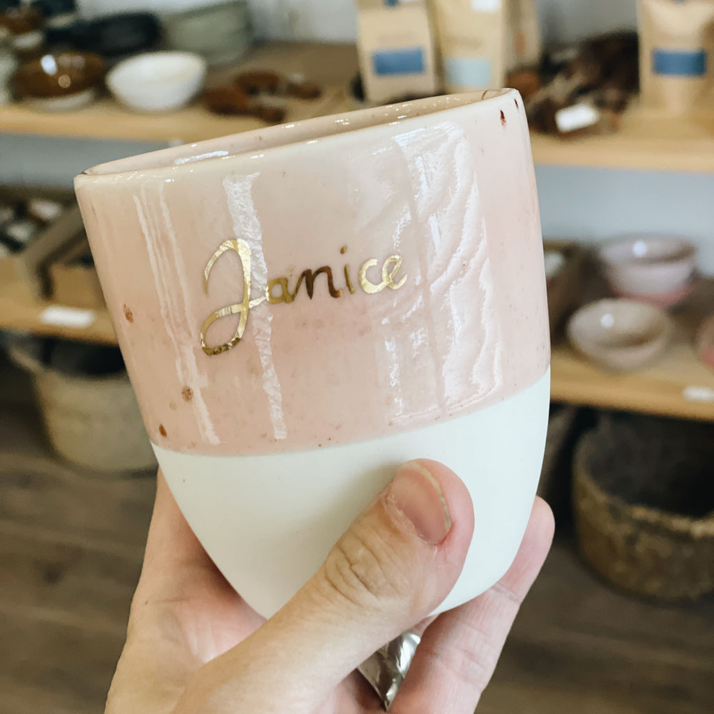 Choose from our curated selection of stunning glazes, and we’ll hand-paint your name in elegant, true gold lustre for a truly unique piece.