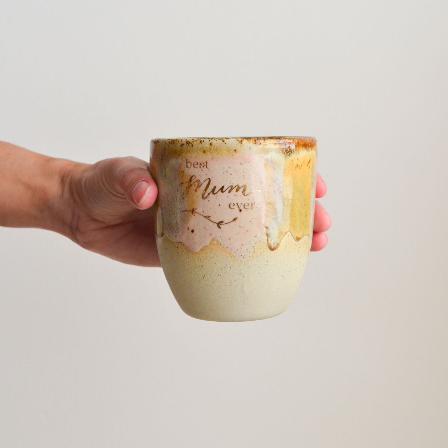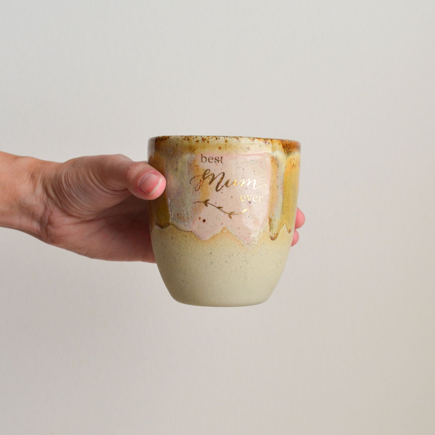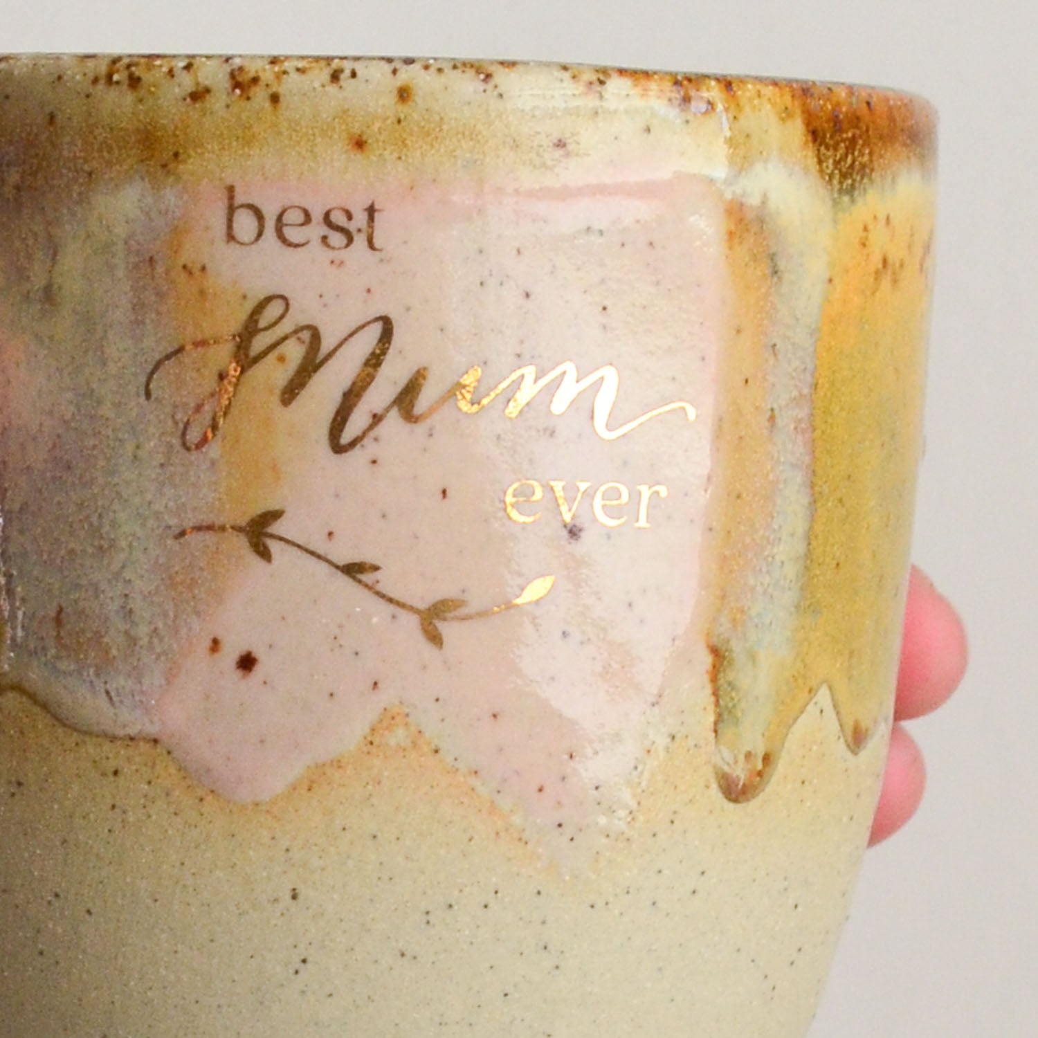 Honour the most amazing Mum with this handmade stoneware cup, featuring the charming 'Best Mum Ever' print in gorgeous gold lustre finish.