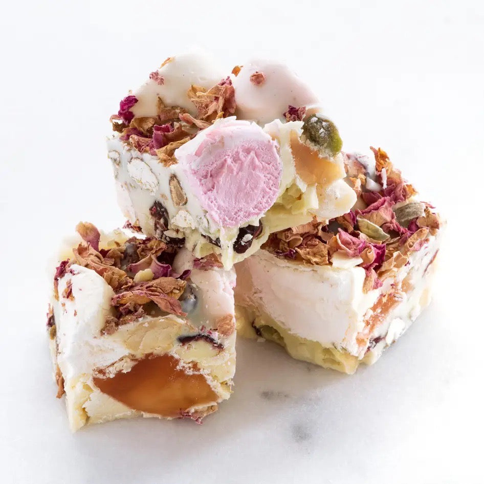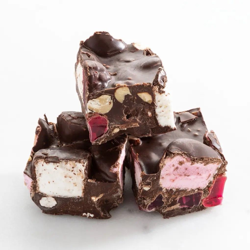 Indulge in Charlotte Piper's decadent Rocky Road Bar – luxurious Belgian chocolate loaded with fluffy marshmallows, sweet jellies, and crunchy peanuts for that classic, irresistible contrast of textures and flavours.
